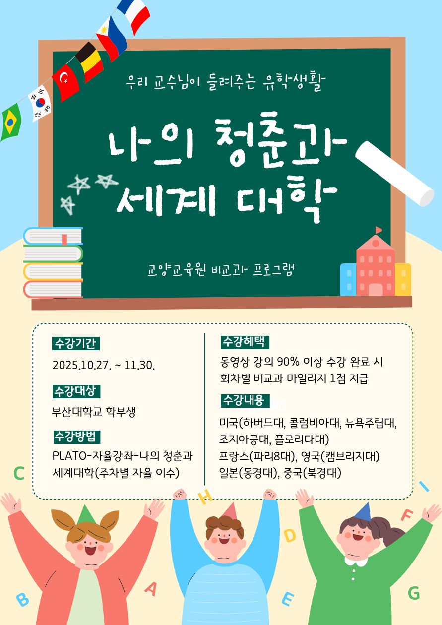 *비교과 프로그램 "나의 청춘과 나의 세계 대학" 수강 안내입니다.*현재 PLATO에서 수강신청 가능하며, 수강기간은 2025.11.30.(일)까지입니다.*PLATO - 자율강좌-"나의 청춘과 세계대학" 검색*수강은 2025.10.27.(월)부터 가능합니다.