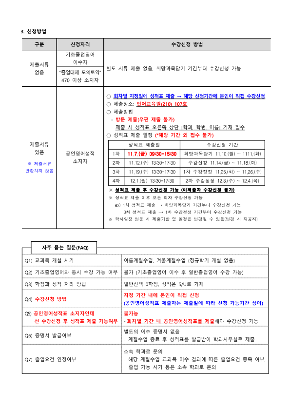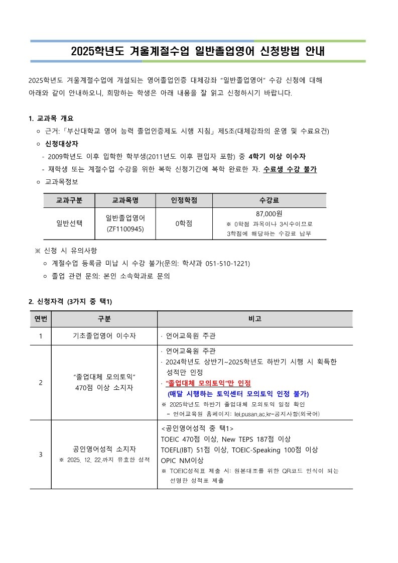 fnctId=bbs,fnctNo=2676 [2025.겨울계절] 일반졸업영어 수강신청 안내(영어졸업인증 대체강좌) *일정 수정 date 2025.09.29 name 윤휘정 e-mail view 61 ※ 1차 제출일정이 아래와 같이 변경되었으니 참고하시기 바랍니다. 당초) 11.6.(목) 13:30~17:30변경) 11.7.(금) 09:30~15:30 첨부파일 2025-겨울 일반졸업영어 안내문.pdf 미리보기